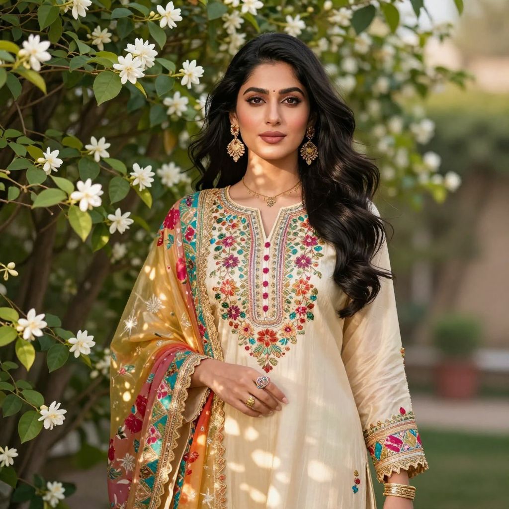 Pakistani beauty with flowing black hair, wearing colorful embroidered shalwar kameez, standing in a lush garden with jasmine flowers, warm sunlight casting gentle shadows, serene expression