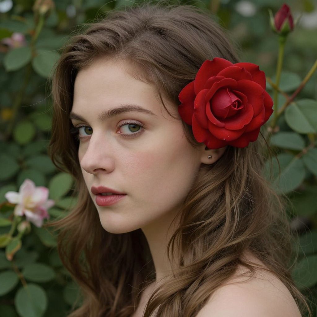 Photograph of a young Caucasian woman with fair skin and long, wavy brown hair. She wears a large, vibrant red rose in her hair on the right side of her head. Her green eyes are slightly turned to the left, and her lips are lightly pink. She has small, gold hoop earrings. The background is a blurred garden with green leaves and a few pink and white flowers. The lighting is natural, highlighting her soft features and the rich red of the rose. Her expression is calm and slightly pensive.