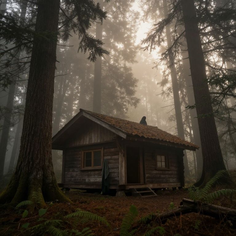 Recluse in a misty forest cabin, surrounded by towering ancient trees, soft rays of dawn light filtering through the fog, a solitary figure wrapped in a cloak, serene and contemplative atmosphere, detailed textures of wood and foliage, muted earth tones.