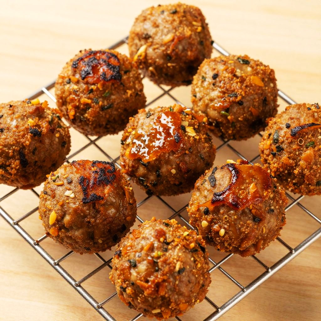 Photograph of nine golden-brown, crumbly meatballs with visible black pepper and orange vegetable chunks, arranged on a metal cooling rack. The meatballs have a shiny, glazed surface with some charred spots. The background is a light wooden surface, providing a warm, rustic contrast to the vibrant, textured meatballs. The cooling rack's grid pattern adds a sense of structure and order to the image. The lighting is bright and even, highlighting the meatballs' rich, appetizing colors and textures.
