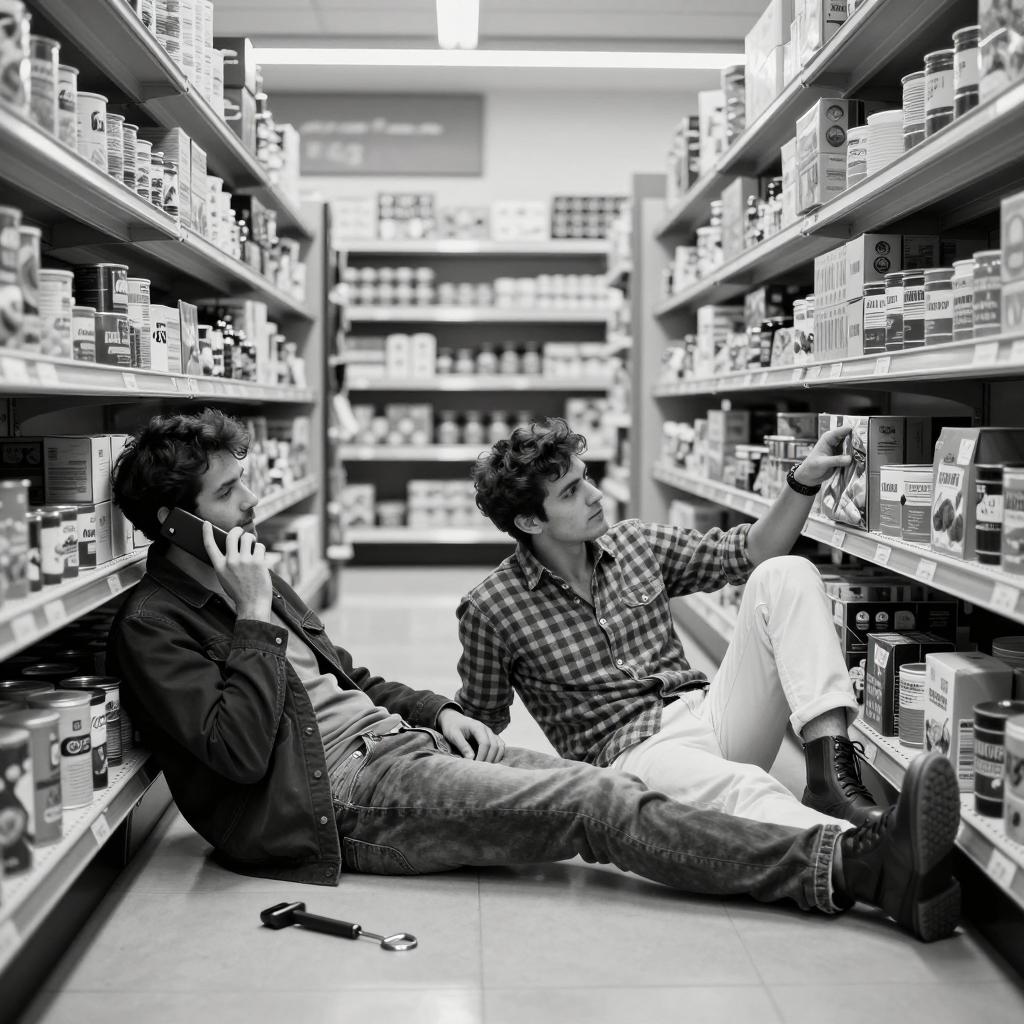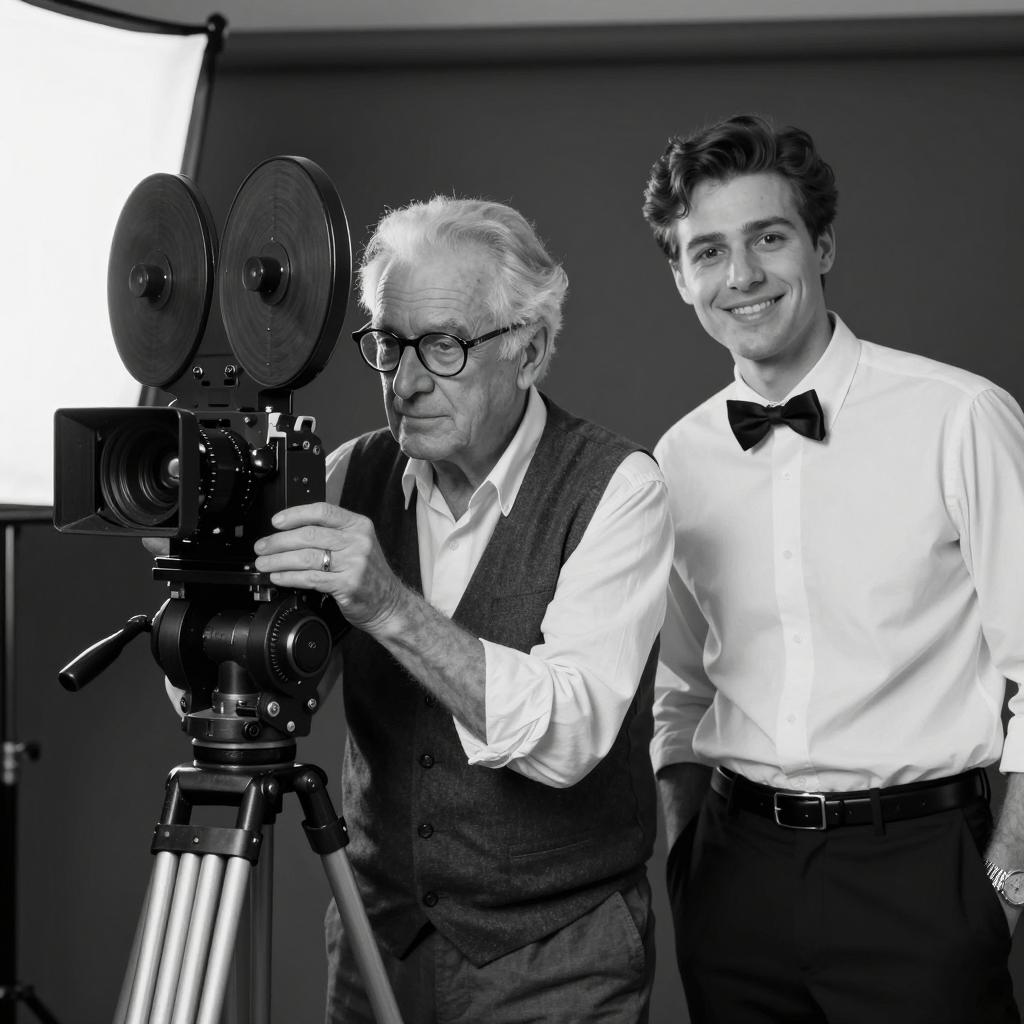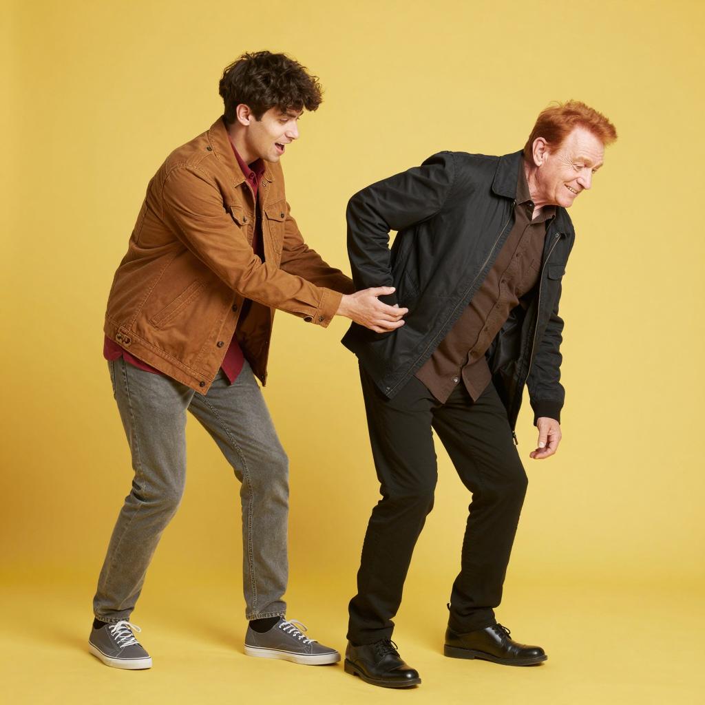 Two men against a bright yellow background. Young man with short black hair, brown jacket, red shirt, gray pants, and gray shoes, grabs older man's waist, bending him forward. Older man with red hair, black jacket, brown shirt, black pants, and black shoes, smiles. Young man's face shows excitement, older man's face shows happiness. Both standing on yellow floor.