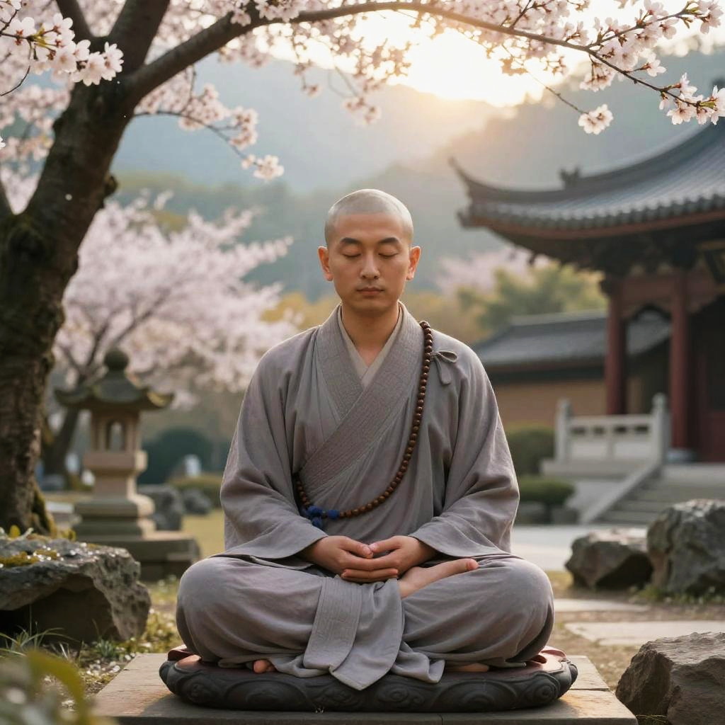 Close-up of a bald light skin man meditating in a serene natural landscape, soft morning light, gentle breeze ruffling nearby leaves, realistic artwork focusing on calm expression and peaceful environment, harmonious color palette.