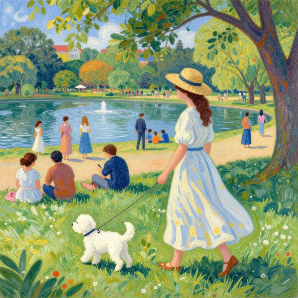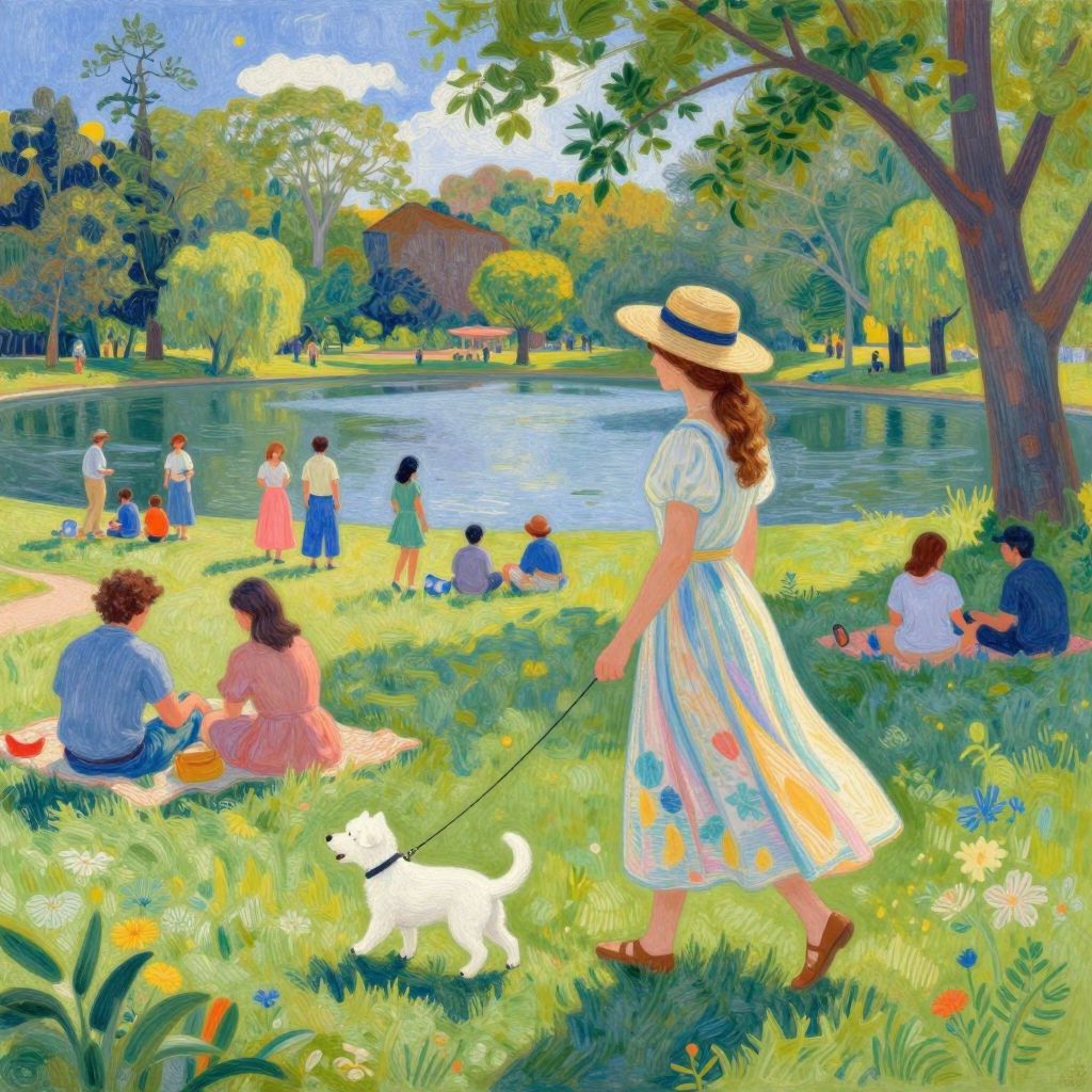 A vibrant digital illustration inspired by post-impressionist techniques, featuring a serene park scene where a woman in a straw hat and flowing dress walks her white dog amidst a lively gathering of people near a tranquil lake, capturing the essence of a leisurely afternoon with vivid colors and detailed textures.