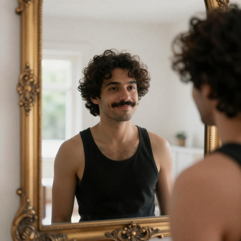 Photograph of two men in a bathroom. Foreground man with dark hair and beard, serious expression, wearing white shirt. Background man with short dark hair, partially visible, looking at first man. Illuminated mirror, tile wall, warm lighting.