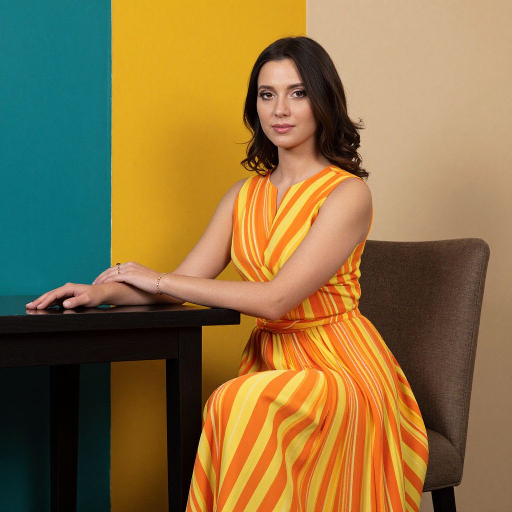 Seated woman in vibrant orange-and-yellow striped dress elegantly positioned against a geometrically divided background, featuring teal, yellow, and beige panels, with her hands resting gracefully on a dark wooden table while seated on a brown upholstered chair.