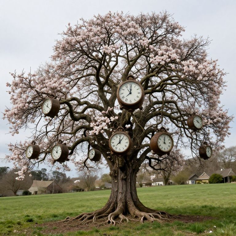 Photograph of a large, leafless tree in full bloom with pale pink cherry blossoms. Eleven round, white clock faces are mounted on its dark brown branches, each displaying different times. The tree stands in a lush green grassy field with a few houses and trees in the background. The sky is overcast, casting a soft light on the scene. The tree's thick trunk and roots are prominently visible at the base. The image combines natural beauty with a whimsical, time-themed element.
