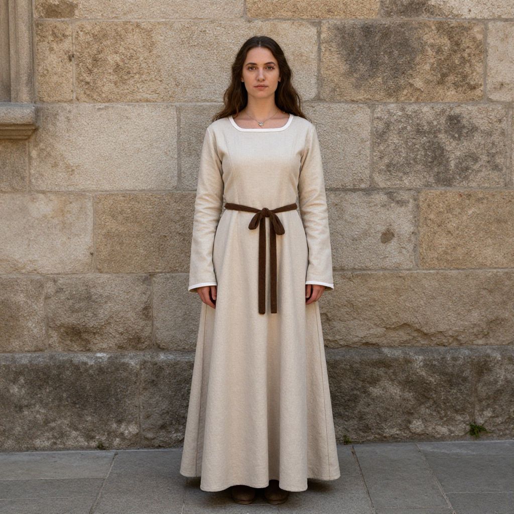 Simple Medieval Costume, woman in a beige dress standing in front of a stone wall