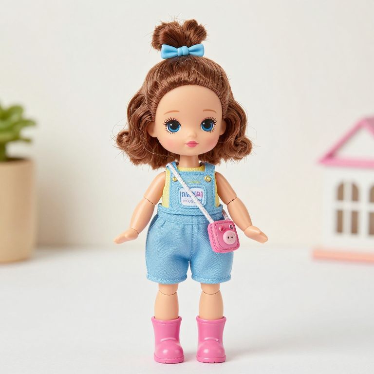 Small pixie doll with brown curly hair tied with a blue bow. The doll has large blue eyes, pink lips, and is dressed in light yellow shirt and blue denim overalls. It carries a small pink purse and wears bright pink rubber boots. Background features neutral tones and blurred house and plant props.