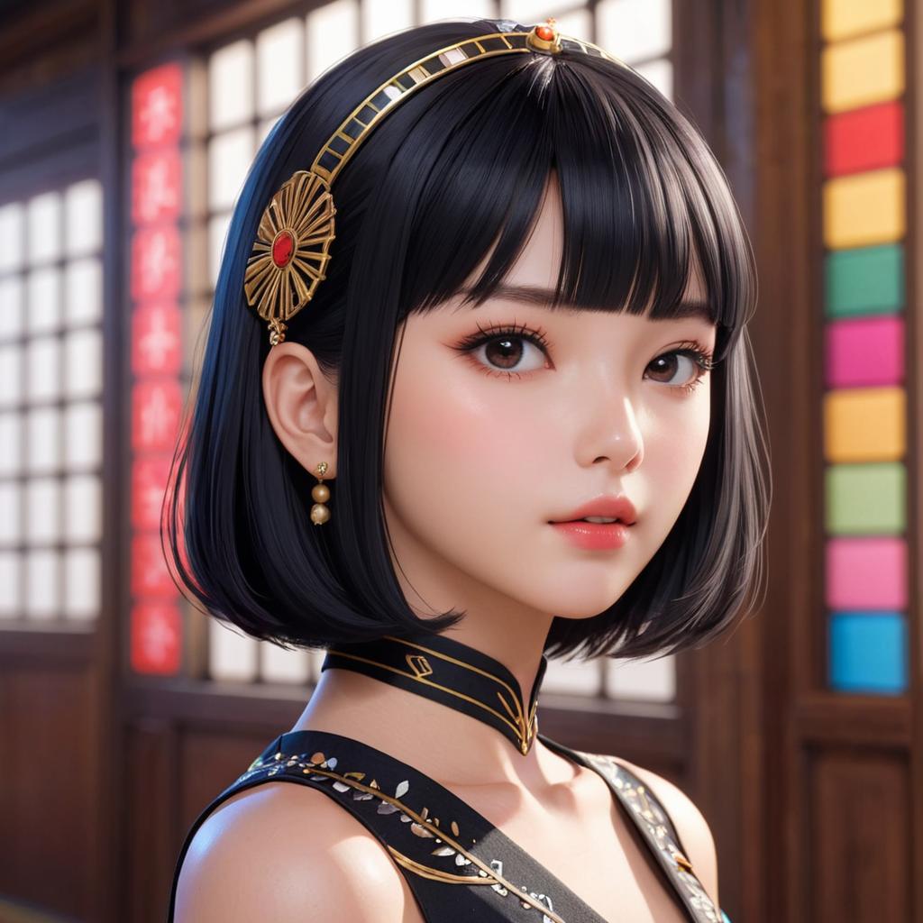 Portrait of Asian Woman with Black Hair and Hair Ornament