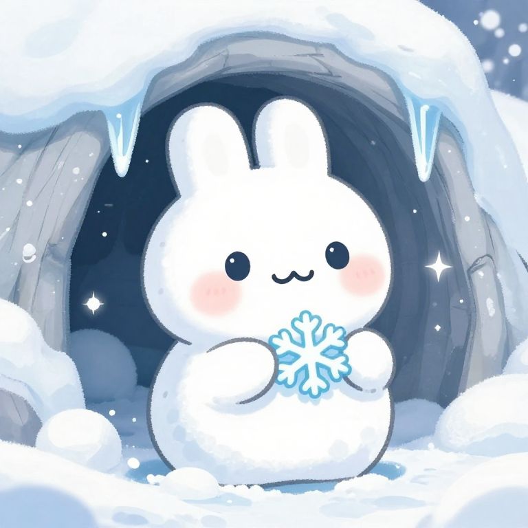 Kawaii snow bunny character with chubby cheeks and a tiny pink nose, nestled in a cozy snow cave decorated with icicles, holding a small snowflake in its paw, background of gentle snowdrifts and twinkling stars, anime inspired style