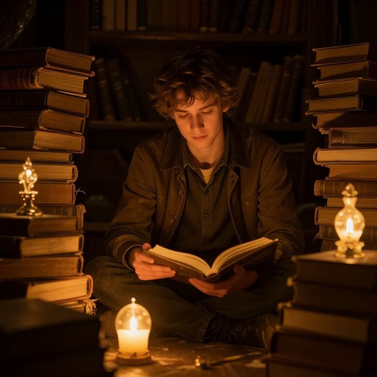 Photograph of a young man with dark, wavy hair and fair skin, sitting cross-legged on the floor in a dimly lit library. He is wearing a dark jacket over a black shirt and is intently reading an open book. Surrounding him are tall stacks of books on both sides, and three small, glowing candles are placed on the floor in front of him. The warm candlelight casts a soft glow on his focused expression and the book's pages. The background is filled with more bookshelves, creating a cozy, intimate atmosphere. The overall mood is serene and studious.