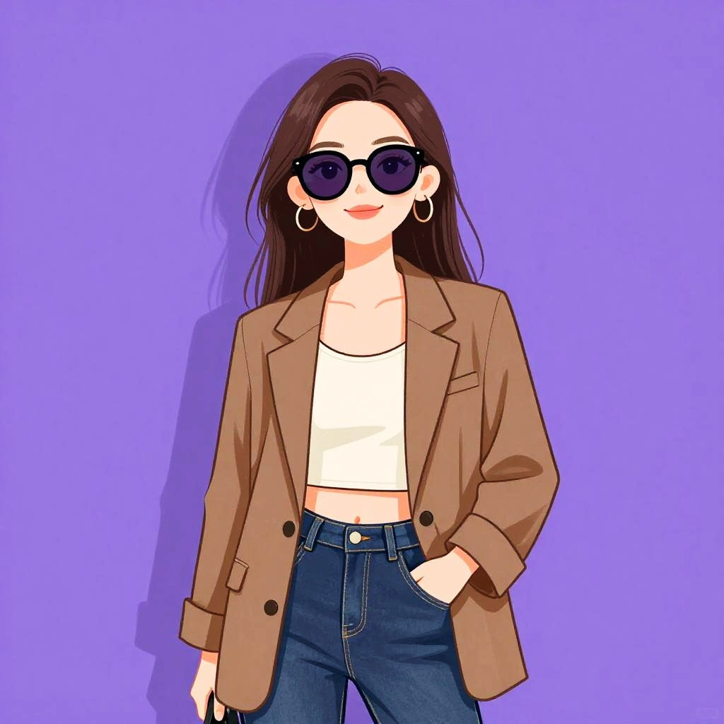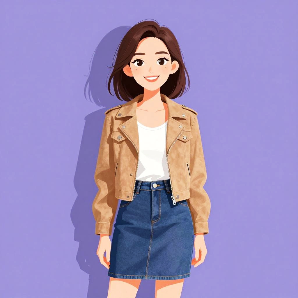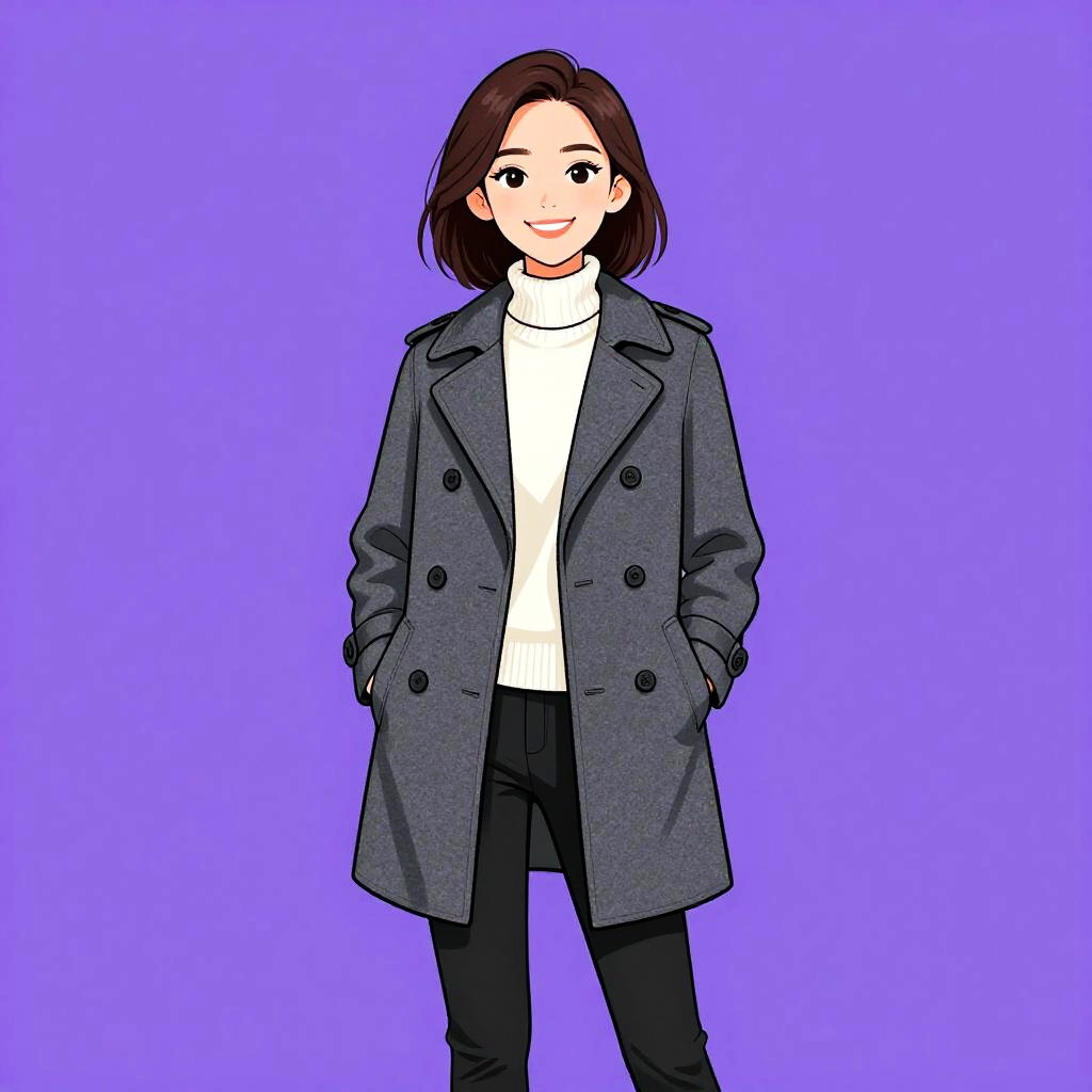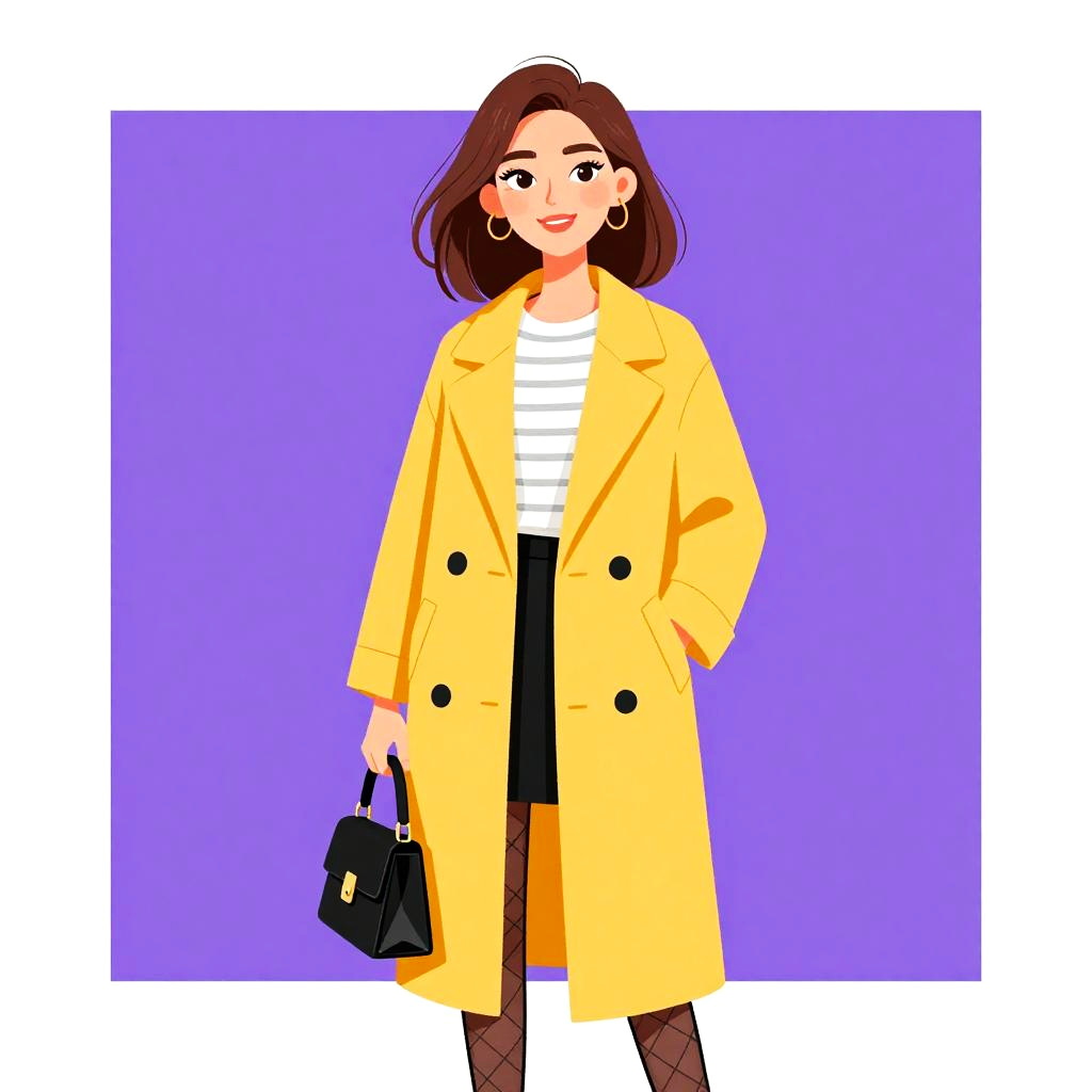 Illustration of a young woman with long brown hair wearing a beige double-breasted trench coat featuring oversized black buttons and adjustable sleeve straps. She pairs the coat with a white blouse and dark-wash denim jeans. The background is a plain neutral lavender color.