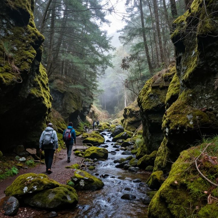 Photograph of a misty forest gorge with two hikers walking on a rocky, moss-covered path beside a flowing stream. The hikers, wearing backpacks and outdoor gear, are positioned on the left; one has a gray jacket and the other a blue jacket. Towering, moss-covered rock formations frame the path, with dense, tall trees in the background. The stream runs through the center, reflecting the overcast sky. The scene is lush with green moss and brown earth tones, creating a serene, natural atmosphere.