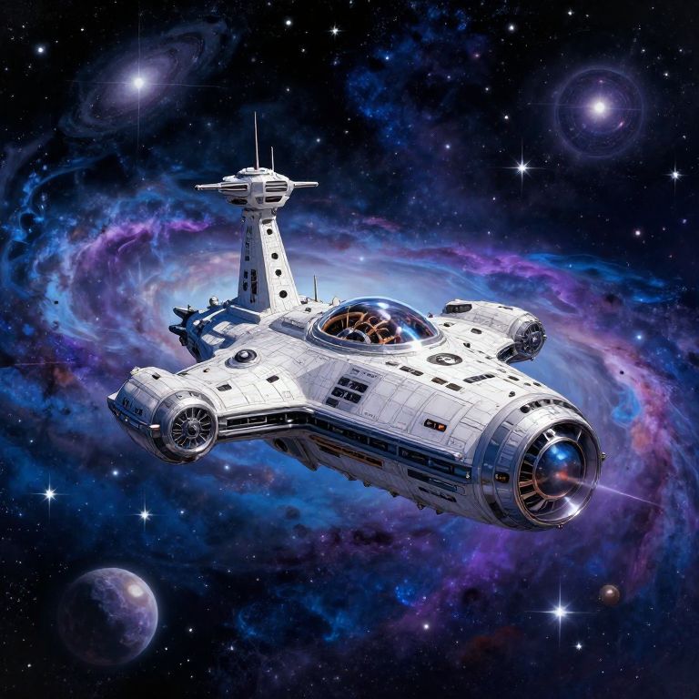 Photorealistic digital illustration of a white, blocky Star Wars-style spaceship flying through a colorful nebula in space. The spaceship has a central cockpit with a visible pilot, two large cylindrical engines, and a tall, rectangular tower with antennae. The background features a dark blue and purple nebula with swirling gas clouds, bright stars, and a small planet in the lower left. The ship's surface has detailed textures, including panels and vents, and emits a subtle blue glow from its engines.