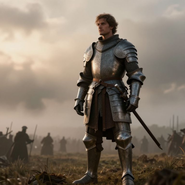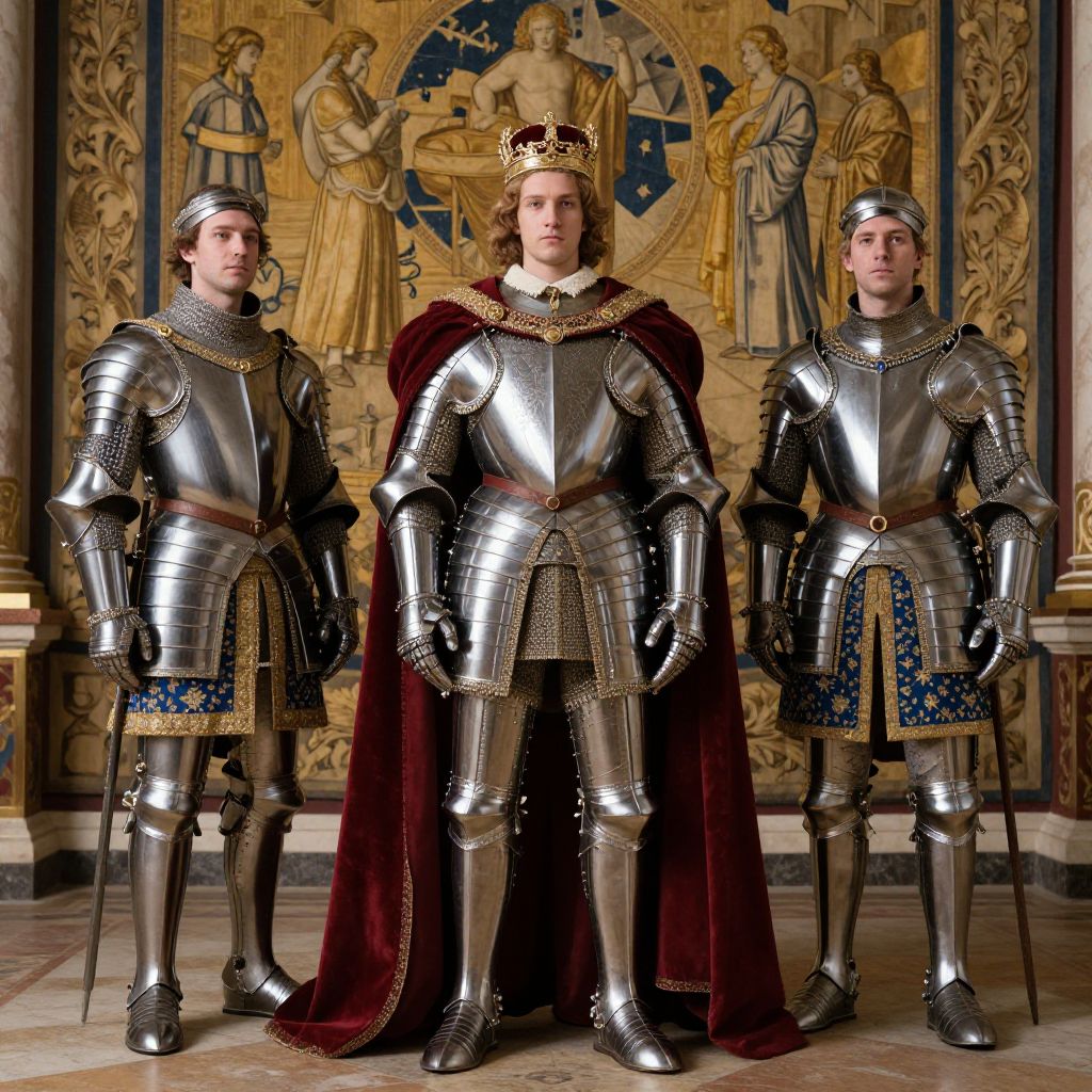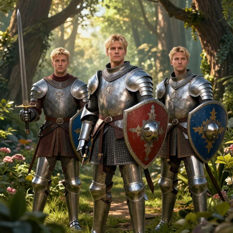 Male blonde characters as medieval knights in shining armor, holding swords and shields, in a lush enchanted forest under soft golden sunlight