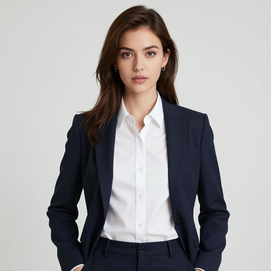 Photograph of a young woman with fair skin, brown eyes, and long, straight dark brown hair. She wears a black blazer over a crisp white button-up shirt and black pants. Her hands rest in her pockets. She has subtle makeup, with light pink lips and small silver earrings. The background is a plain, bright white, making her the focal point. She has a serious, composed expression. The lighting is even, highlighting her features and attire. Her overall appearance is professional and confident.