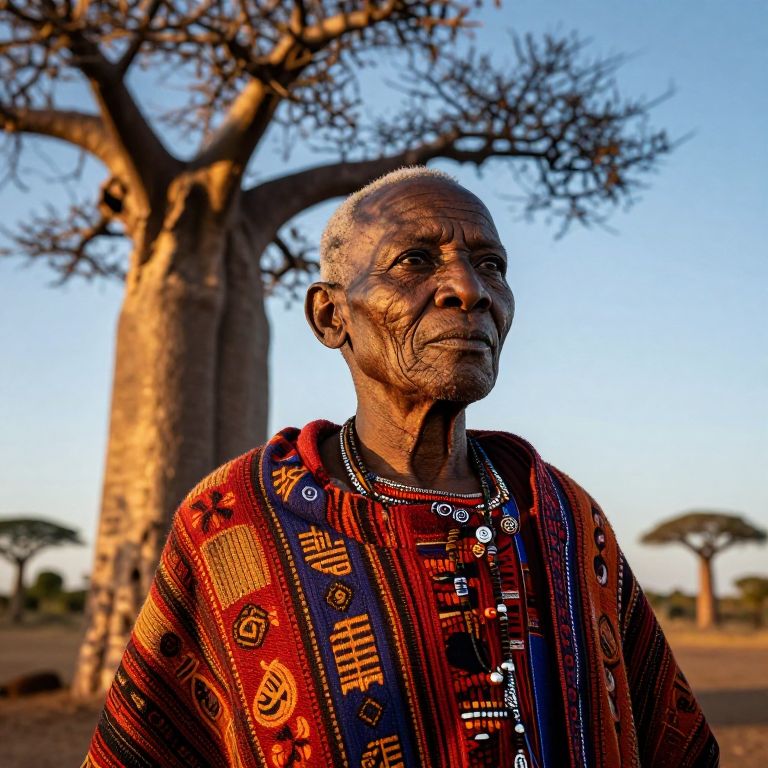 Photograph of an elderly African man with dark, wrinkled skin and short gray hair, wearing a vibrant, patterned red and blue traditional garment adorned with beads and intricate designs. He stands in front of a large, leafless baobab tree with a textured trunk, set against a clear, blue sky at sunset. The man's expression is serious, and the warm, golden sunlight casts dramatic shadows on his face and the tree, highlighting the textures and colors of his clothing and the landscape. The background includes blurred acacia trees, emphasizing the African savanna setting.