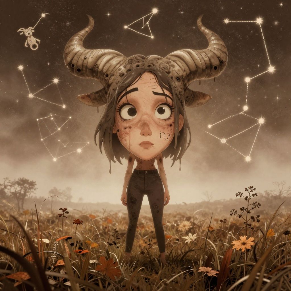 Digital artwork of a worried young girl with large, curved horns, standing in a grassy field under a starry night sky with constellations.