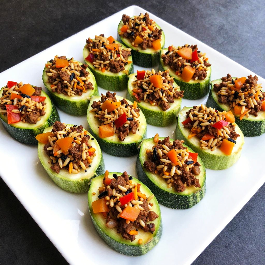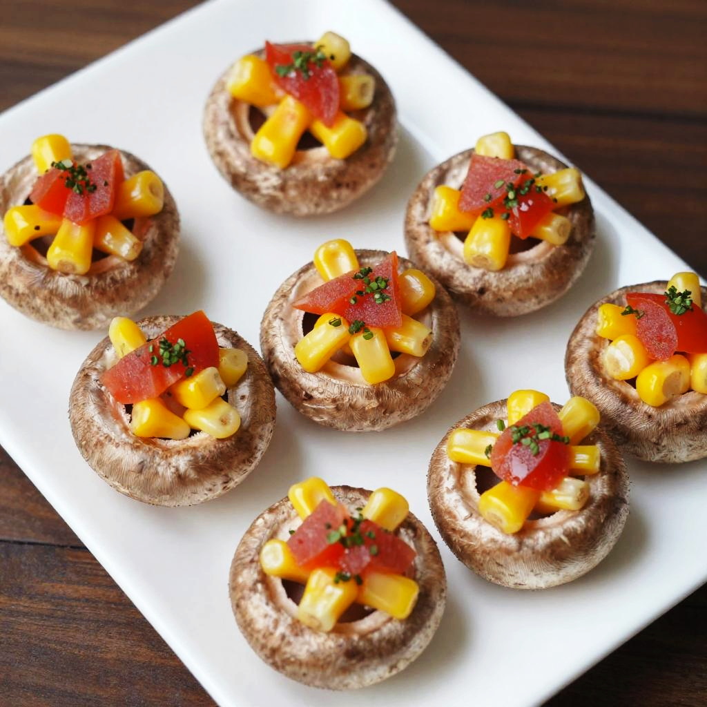 Photograph of seven stuffed mushroom caps on a white rectangular plate. Each mushroom cap is filled with a colorful mixture of diced yellow corn, red tomatoes, and green herbs. The mushrooms have a brown, slightly rough texture, and the filling looks fresh and vibrant. The plate is set on a dark wooden surface, adding a rich contrast to the bright filling.