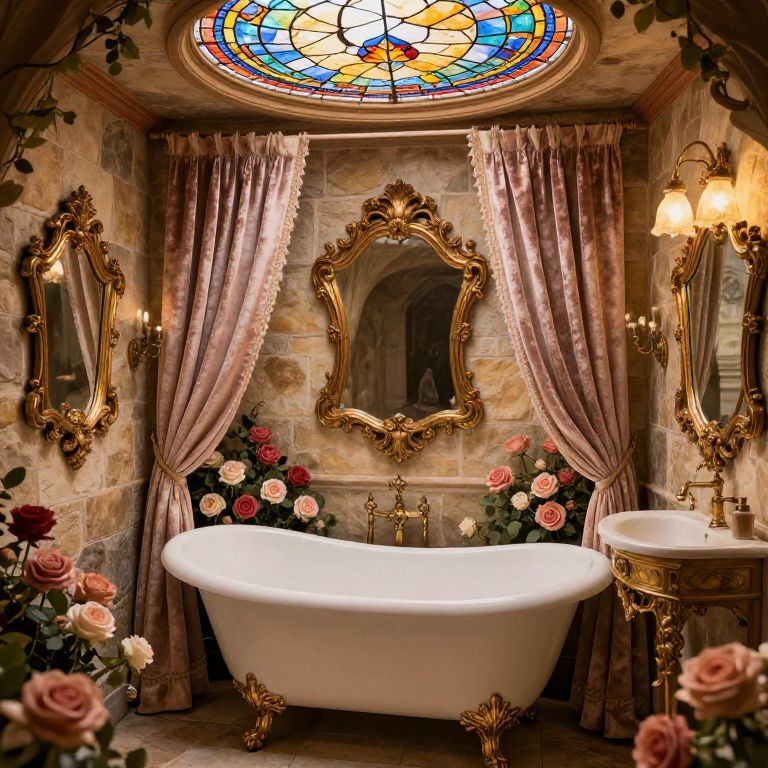 Beauty and the Beast bathroom with lush rose-themed decor, delicate gilded mirrors, clawfoot tub surrounded by soft velvet curtains, enchanted stained glass overhead, warm ambient lighting, rustic stone walls mixed with luxurious details, whimsical and romantic fairytale setting.