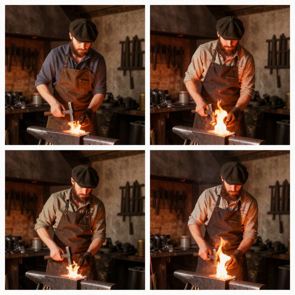 A four-image photograph collage shows a bearded man with a dark beard and mustache, wearing a black cap, beige long-sleeve shirt, and brown apron, focusing on a fiery forge in a dimly lit blacksmith shop. He uses tongs to handle glowing metal on an anvil, with bright orange flames illuminating his face and apron. The background includes darkened walls, shelves with tools, and a window with iron bars. The images capture different angles and moments of his work, highlighting his concentration and the intense heat. The overall style is realistic and dramatic, emphasizing the artisanal craft.