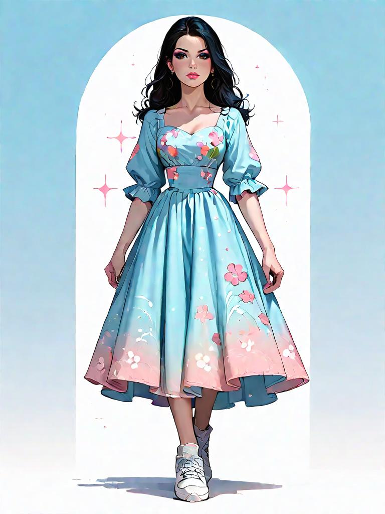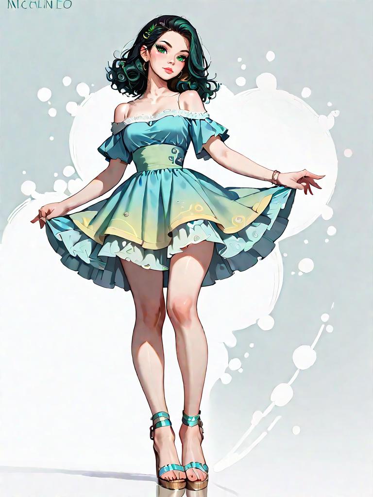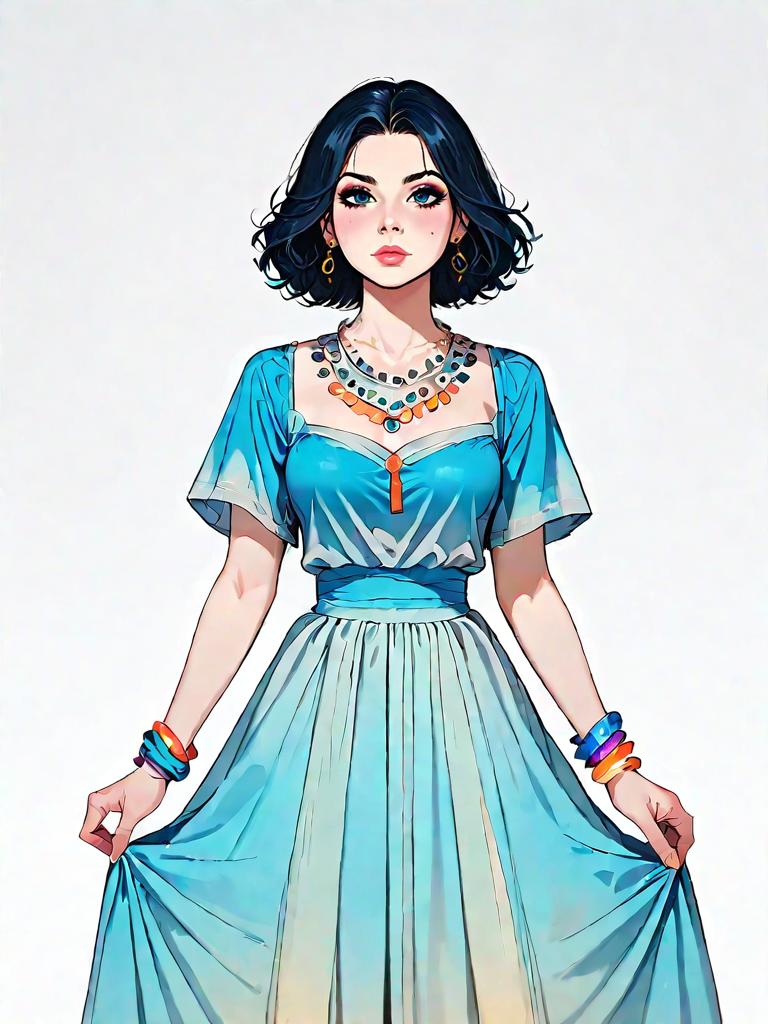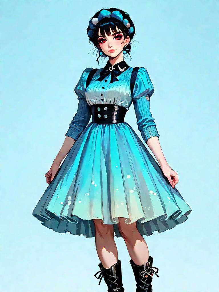 1girl, realistic face, Deep V Back Midi Dress, soft jersey material, classic navy blue, subtle ribbed texture, short puff sleeves, cinched waist, layered ruffle hem, matched with black ankle boots, chunky knit cardigan, edgy yet relaxed style.
