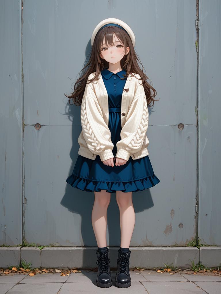 A young woman standing against a gray metal door, wearing a classic navy blue deep V back midi dress with short puff sleeves and a layered ruffle hem. She pairs the dress with a chunky cream knit cardigan and black lace-up ankle boots. Her long brown hair is complemented by a white beret, creating a stylish yet relaxed look.