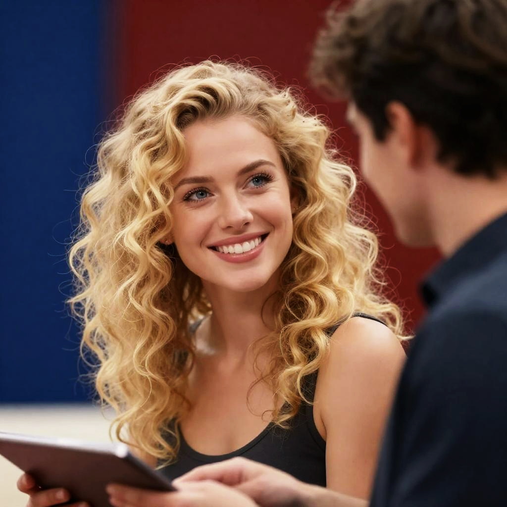 Photograph of a blonde woman with curly hair, smiling, wearing a white lace hat with purple and white flowers, holding a blue umbrella. A man with blonde hair, seen from the back, faces her. Blue background. Woman's face light and joyful, man's expression not visible.