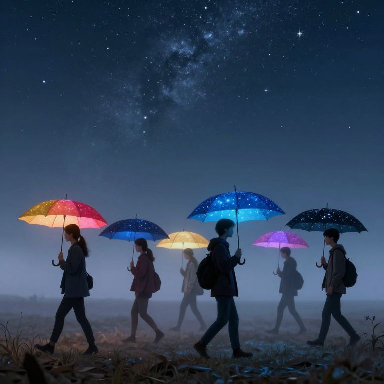 Digital artwork depicting six silhouetted individuals walking through a misty, starry night under a galaxy-filled sky. They hold colorful umbrellas—red, yellow, blue, and purple—reflecting light. The figures, dressed in dark, business-like attire, carry backpacks. The ground is wet, with faint grass visible. The background showcases a deep blue sky with the Milky Way prominently visible. The scene conveys a sense of mystery and tranquility, blending urban and cosmic elements. The overall style is realistic with a touch of fantasy.
