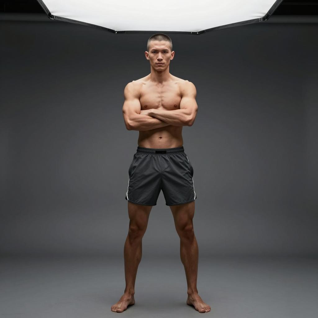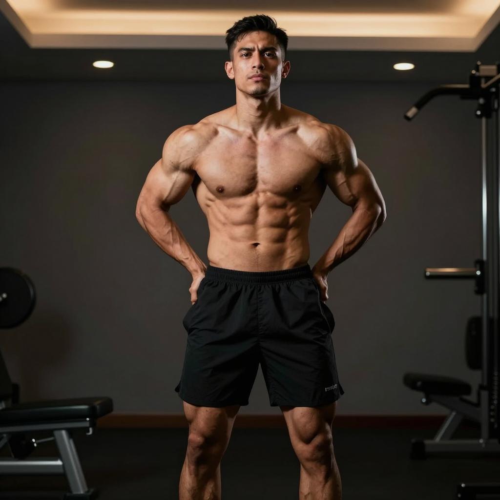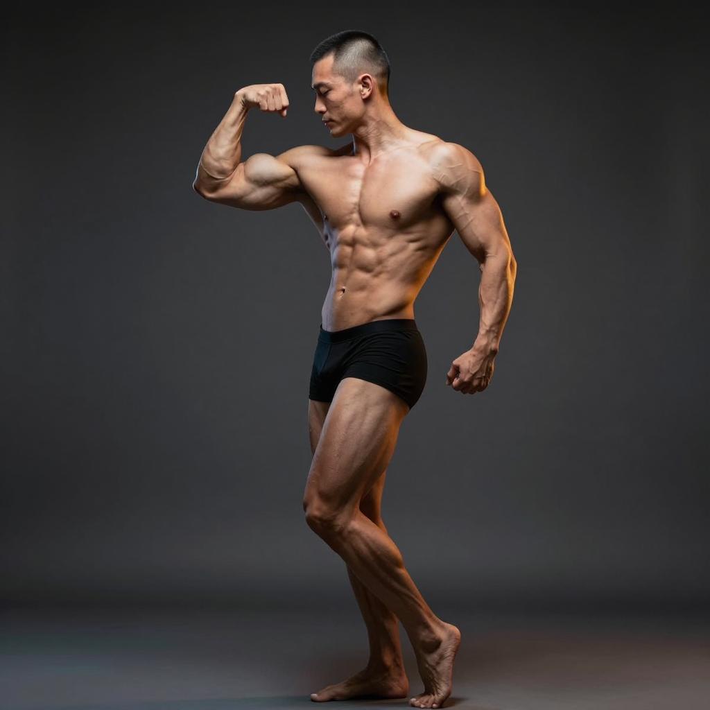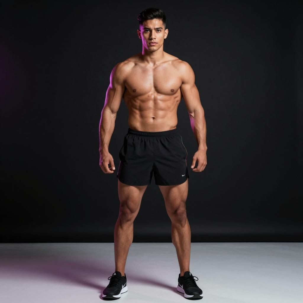 Full body portrait of fit man with sixpack abs, lean fitness model with buzz cut and strong jawline wearing dark navy bodybuilding trunks posed three-quarter turn with one arm on hip and the other flexed in low-key room lit mainly by gels with no clear details under two opposing colored lights outlining shoulders and arms, ultra-detailed bodybuilding photography, 8k, sharp focus