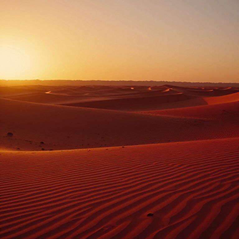 Photograph of a vast, sunlit desert with rippled red sand dunes under a golden-orange sunset sky. Ripples create a textured pattern in