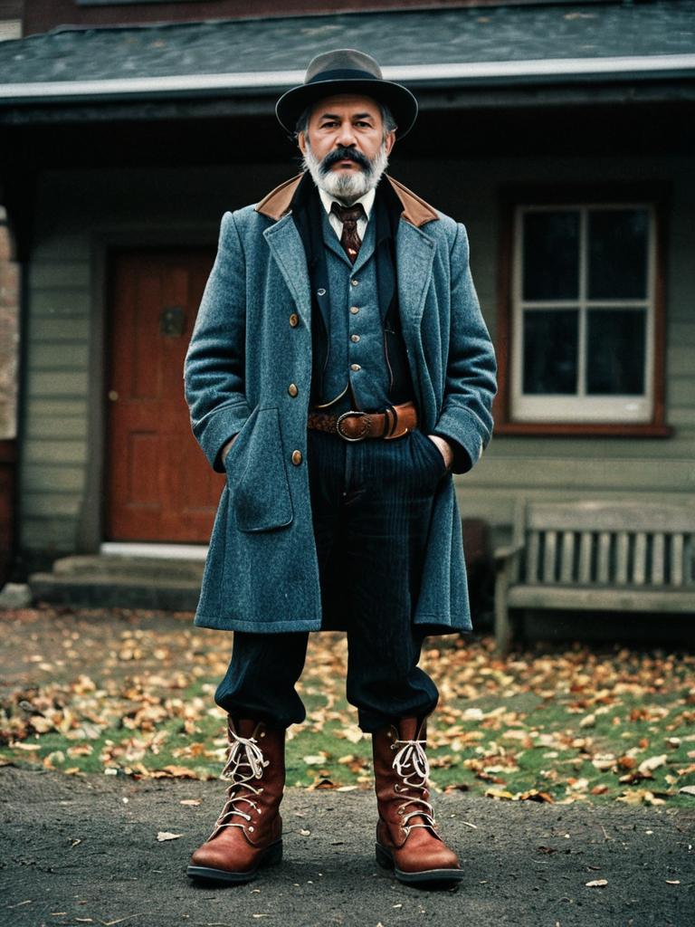 Full body portrait of an older man with gray beard and mustache wearing a vintage style blue wool coat with brown collar details, dark pants, a matching vest and tie, a wide brown leather belt, brown lace-up boots, and a dark gray fedora hat. He stands with hands in pockets on a leaf-strewn path in front of a house with wooden door and window.