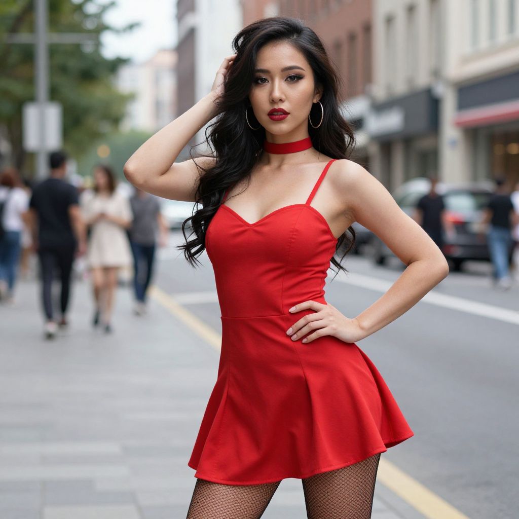 Photograph of an Asian woman with long black hair, wearing a red dress, fishnet stockings, and a red choker, confidently posing on a