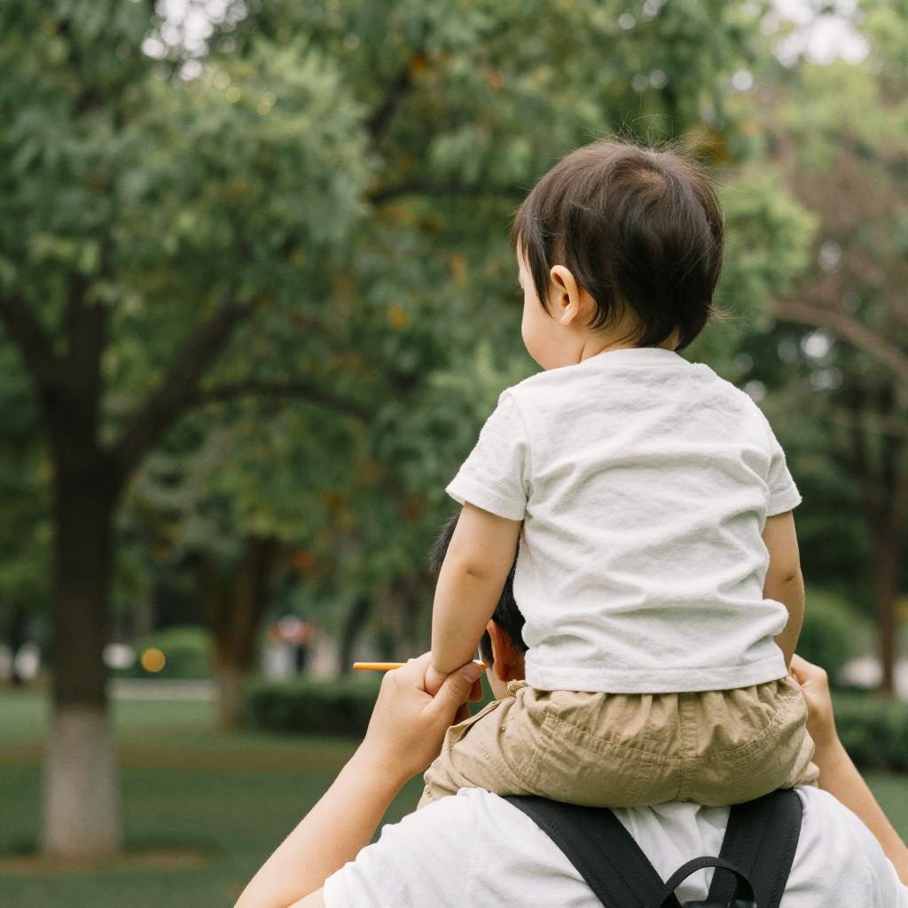 A child holding hands with an adult, backlit by warm sunlight at sunset, silhouettes against a bright sky with soft light and gentle haze, emotional and tender atmosphere