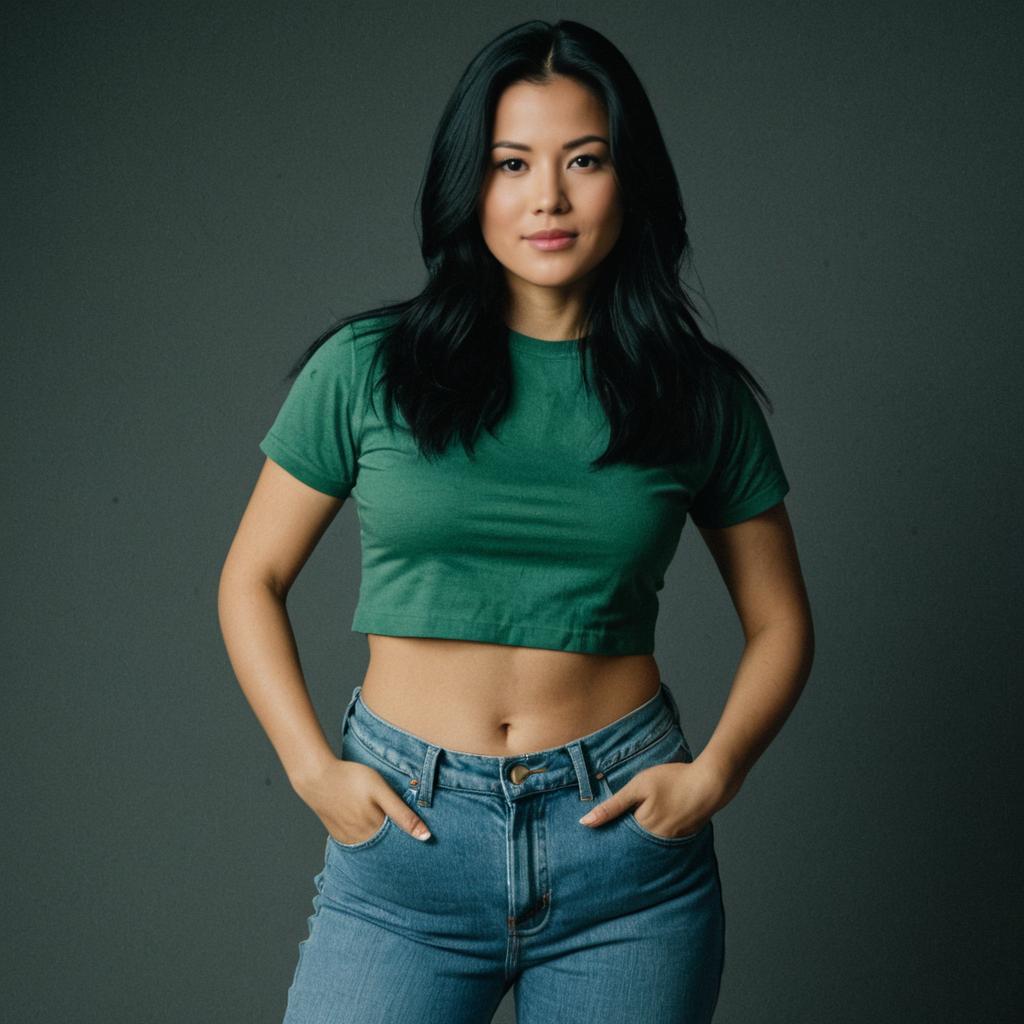 Photorealistic image of an Asian woman standing against a plain dark background. She has long black hair and is wearing a green crop top paired with high-waisted blue denim jeans. She stands confidently with her hands in her pockets, looking directly at the viewer.