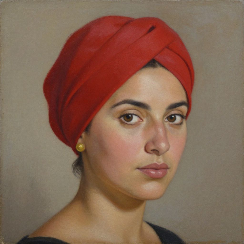 Photorealistic digital painting of a young woman with olive skin, dark brown eyes, and long black hair, wearing a bright red headscarf against