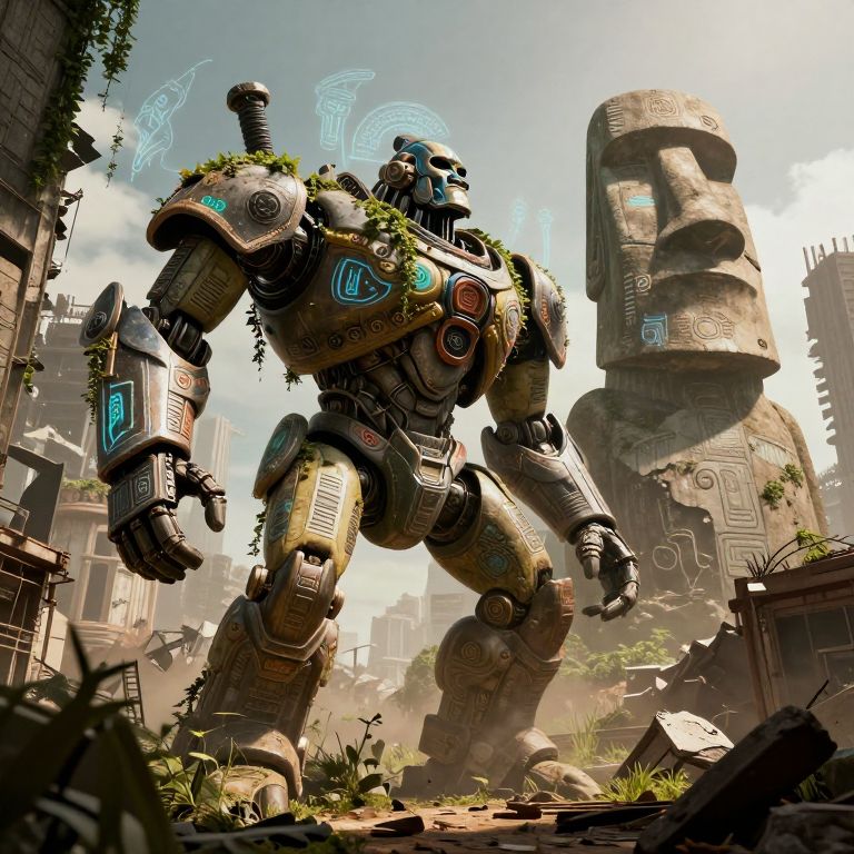 Digital artwork depicting a large, humanoid robot with a weathered, metallic exterior covered in green moss and vines. The robot has blue and red glowing circular panels on its chest and arms, and intricate, tribal-like markings. It stands in a sunlit, ruined ancient temple with large stone statues and ruins. Light blue holographic symbols float around the robot's head. The background features overgrown vegetation and broken structures, creating a juxtaposition of advanced technology and ancient architecture. The scene is bathed in warm, natural light, highlighting the textures and details of both the robot and the surroundings.