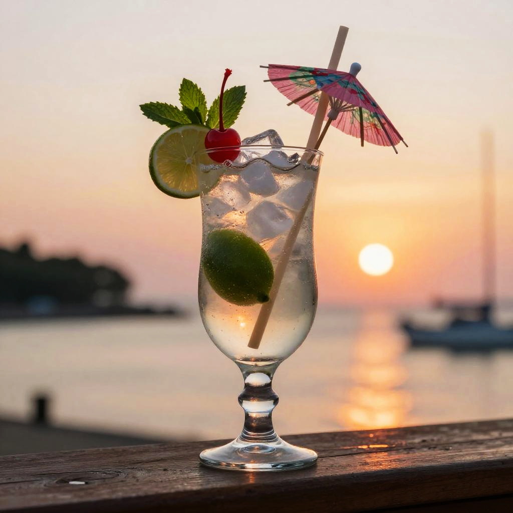 Photograph of a refreshing glass cocktail with ice, lime slices, mint, cherry, and small umbrella, set against a sunset waterfront background.
