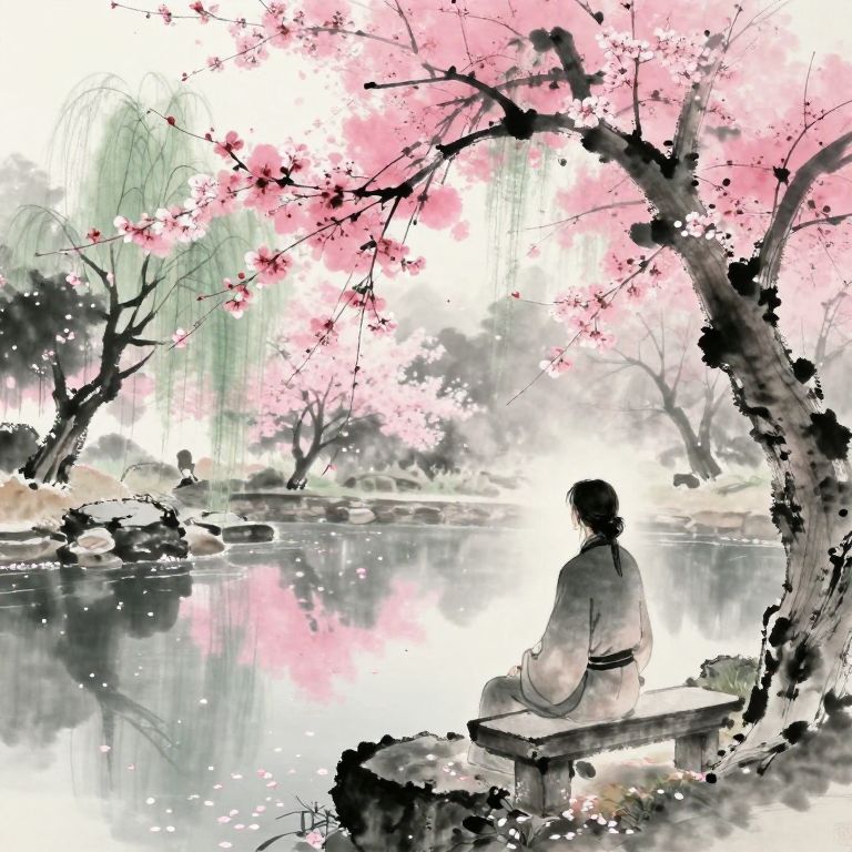 Imagine a tranquil garden painted in the serene style of traditional Chinese ink art, where delicate cherry blossoms gracefully dance amidst ancient willow trees. In the foreground, an introspective figure sits on a stone bench with their back turned, lost in contemplation as they gaze upon a nearby pond. The water's surface is smooth and reflective, mirroring the vibrant pink petals that have fallen like snow onto its calm depths. This serene scene subtly transitions into a dreamlike state, blurring the lines between reality and the subconscious, evoking a sense of introspection and wonderment.
