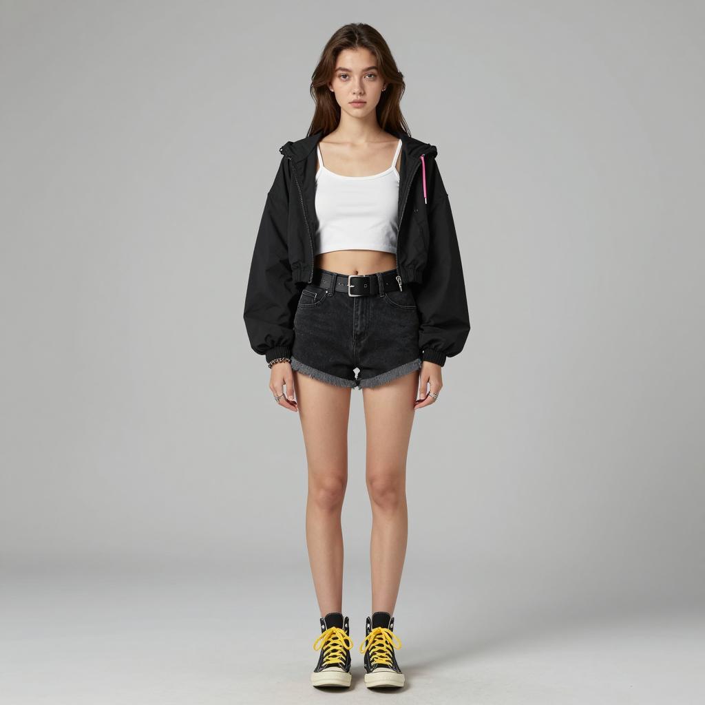Pop stars girl costume, photograph of young woman standing, front view, full body, light brown hair in twin ponytails, wearing black choker, red and white sleeveless vest with "10" on shoulders, black crop top, high-waisted denim shorts, black ankle boots, orange and white background, minimal shadows, casual fashion style, realistic, natural lighting