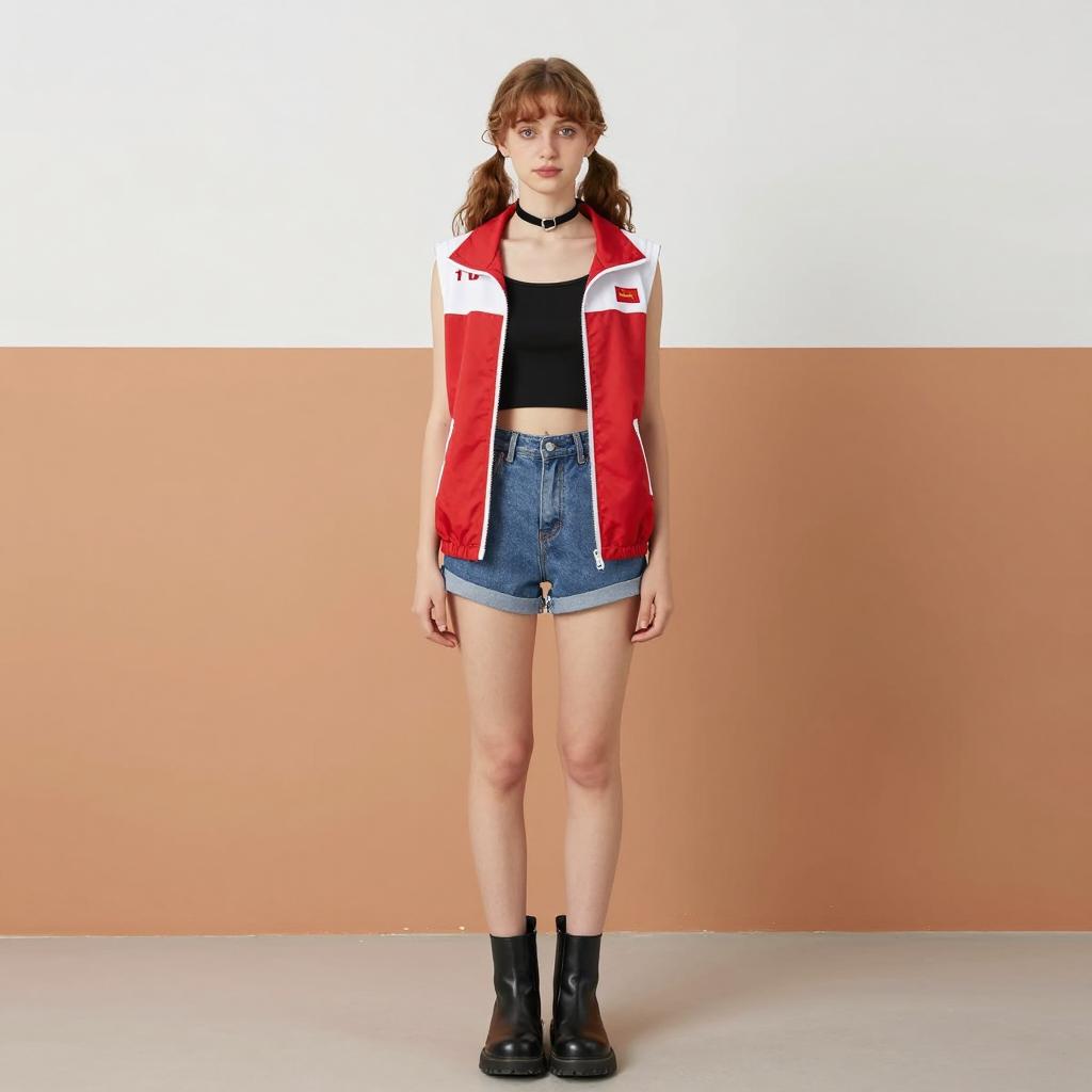 Full body portrait of a young woman with light brown hair styled in twin ponytails wearing a black choker, red and white sleeveless vest with '10' on the shoulders, black crop top, high-waisted denim shorts, and black ankle boots. She stands against a minimalistic orange and white background with natural lighting, showcasing a casual pop star-inspired fashion style.