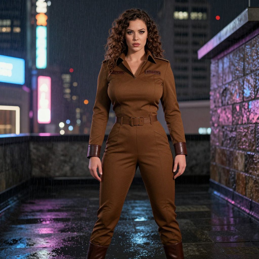 A tall, athletic woman with curly brown hair and a determined gaze dressed in a bold straight brown shoulder costume, posing on a rooftop in a rain-soaked city at night, neon signs reflecting off wet stone walls, the costume has a military-inspired cut with a brown leather trim, realistic cinematic lighting and sharp focus on fabric movement.. The woman has big tits and cute face