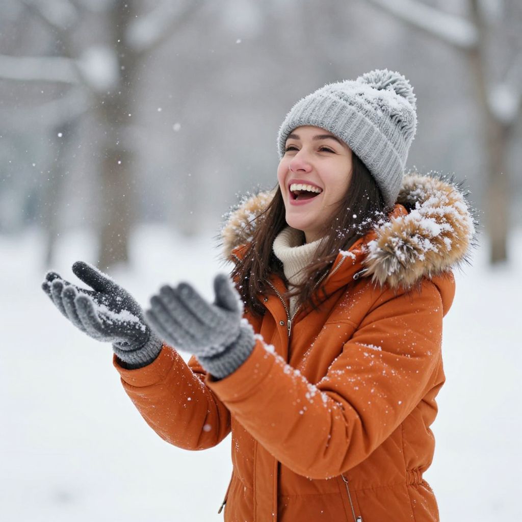 Joyful laughter fills the air as a woman, bundled in a cozy orange jacket with fur-lined hood and gray knit hat, extends her gloved hands to catch falling snowflakes, her face radiating warmth and happiness against the serene backdrop of a snowy landscape.