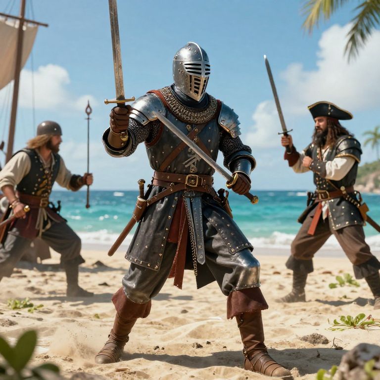 Workable Fixative full body medieval spanish soldier fight by swords againts pirate captain on the bank of Carribbean sea, high detail, ultra realistic, 8k,