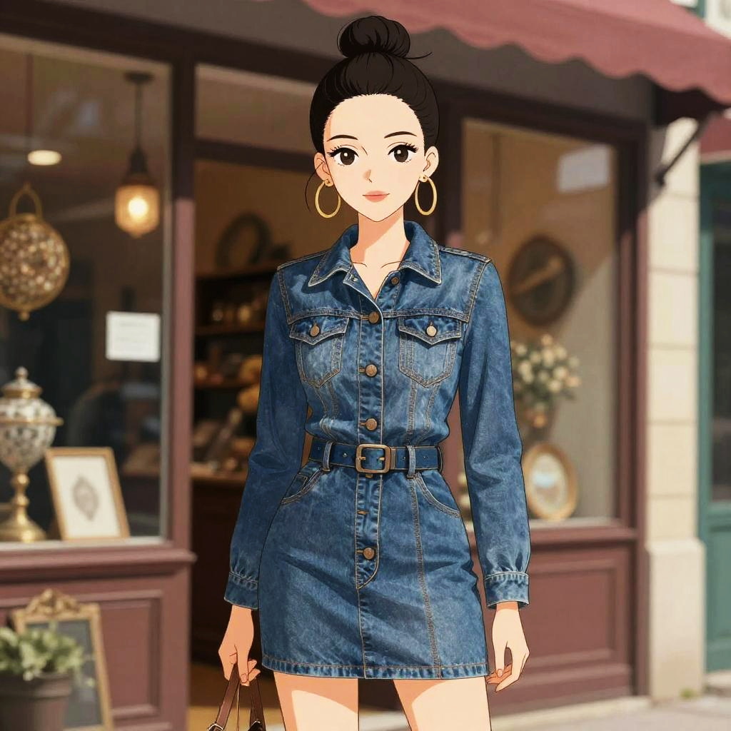 A woman, in a contemporary chic denim mini dress with a fitted waist and structured collar, oversized hoop earrings, and a sleek high bun hairstyle, standing at a vintage boutique in a French quarter, illustrated in the style of Yen Press. Sexy. Pretty face and beutiful eyes