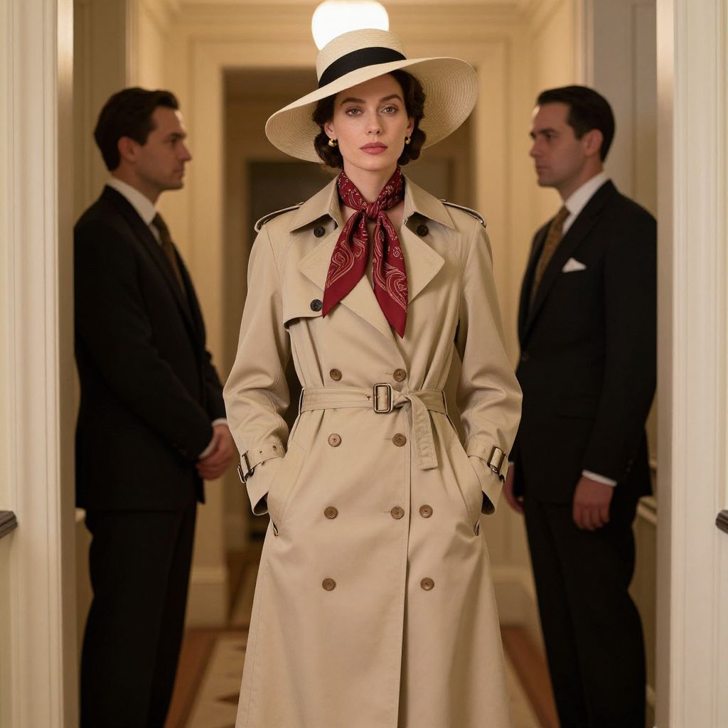 Elegant woman wearing a beige trench coat, wide-brimmed hat, and red paisley scarf stands confidently in a warmly lit hallway, flanked by two men in formal suits, creating a sophisticated and timeless scene reminiscent of Norman Hartnell's classic designs.