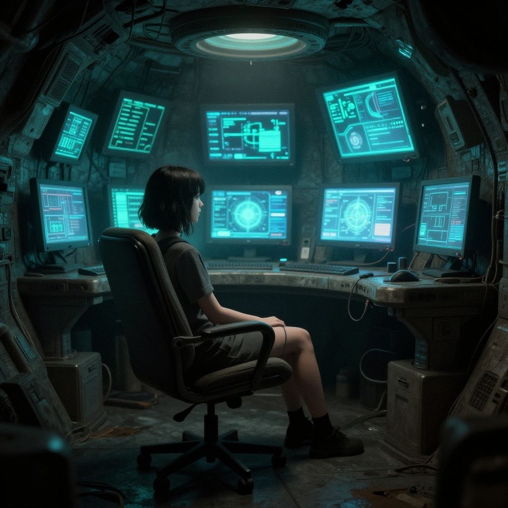 Grainy, detailed, 1girl, sitting, chair, futuristic, bunker, room, bioluminescence lights, monitors