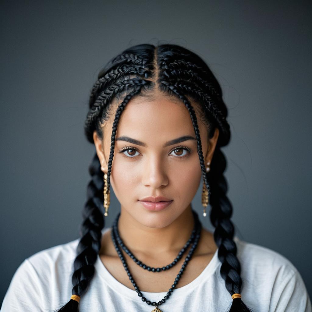 Close-up portrait of a young woman with dark knotless braids styled in twin braids adorned with hair ties. She has a medium skin tone, brown eyes, and is wearing gold earrings along with two black beaded necklaces. The woman is dressed in a white shirt and posed against a blurred gray background, looking directly at the camera with a neutral expression.