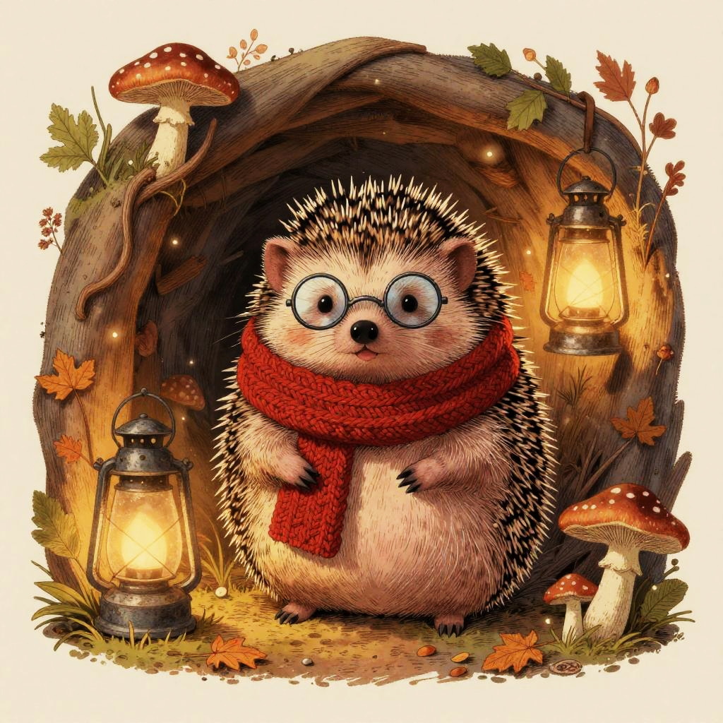 A jovial hedgehog wearing a crimson knitted scarf and tiny round spectacles, set in a cozy burrow warmly lit by lanterns and autumnal fungi, vintage illustration aesthetic with delicate linework and fine crosshatching, muted warm palette on a soft cream backdrop, ornate botanical detailing, gentle and charming atmosphere, soft rim lighting, subtle paper grain texture, balanced and symmetrical composition, slight vignette, natural bokeh sparkle, ultra clean edges, high fidelity details