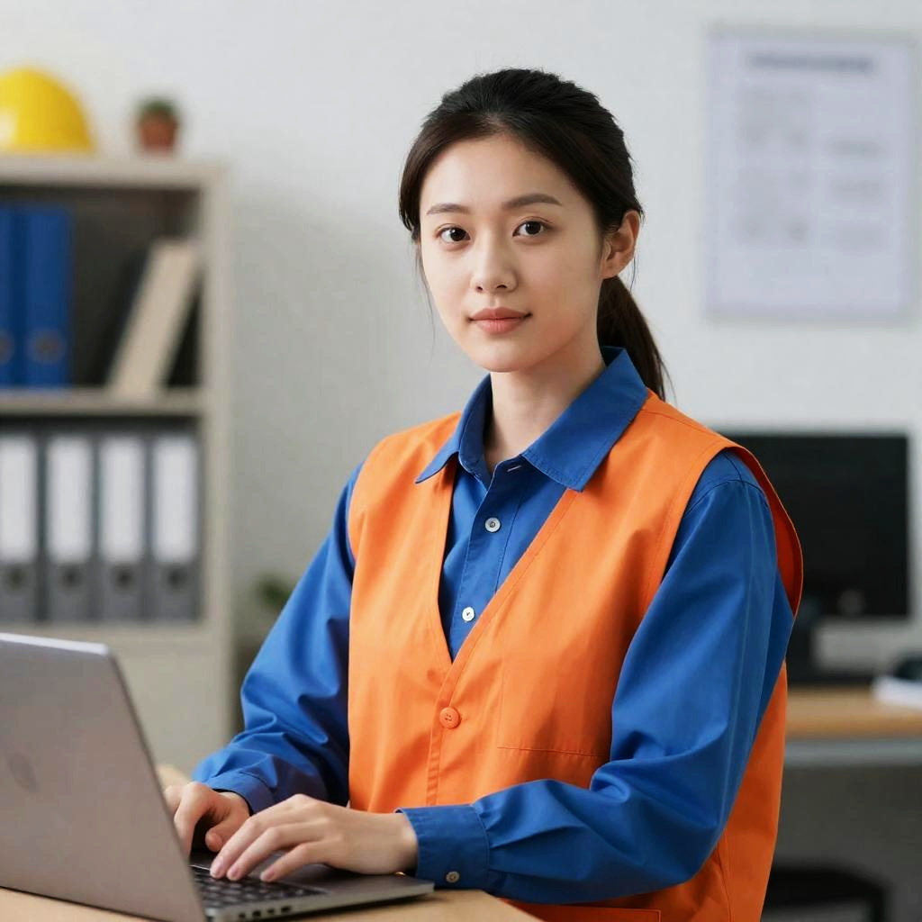 Place Work, woman with a blue shirt and orange vest looking at the camera